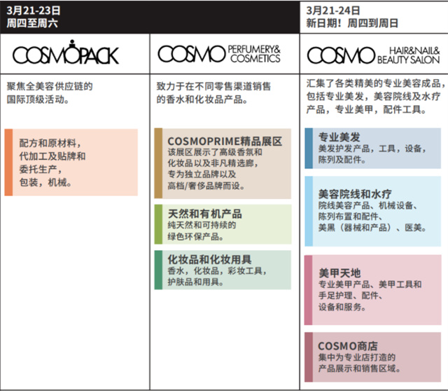 COSMOPROF卡思曼伯意大利博洛尼亞美容展包含三大主題展區(qū),每個(gè)展區(qū)都專注于特定行業(yè)和分銷渠道。