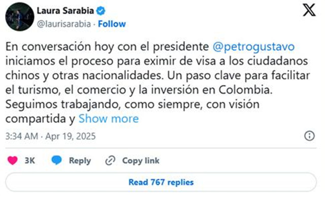 哥倫比亞政府正在考慮對(duì)中國及其他國家公民免簽,以促進(jìn)旅游業(yè)和投資。目前尚未正式公布。哥倫比亞外交部長勞拉·薩拉比亞于4月18日星期五宣布,哥倫比亞政府已啟動(dòng)對(duì)中國及其他國籍公民免簽程序。