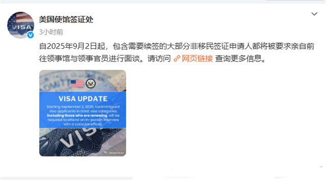 美國(guó)使館簽證處今日剛發(fā)通告:自2025年9月2日起,包含需要續(xù)簽的大部分非移民簽證申請(qǐng)人都將被要求親自前往領(lǐng)事館與領(lǐng)事官員進(jìn)行面談。